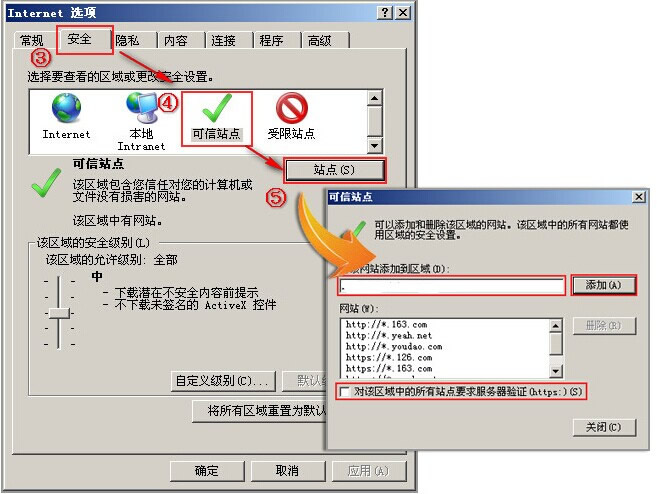 ⑤在“可信站點”的設(shè)置中,點擊“站點”,在彈出的站點窗口中輸入我們的網(wǎng)址如“http://