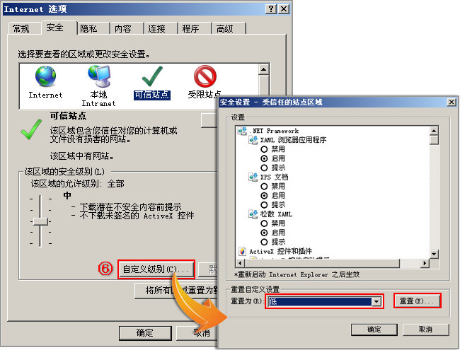 ⑥在“可信站點”的設(shè)置中,點擊“自定義級別”,在彈出的自定義窗口中,將“重置自定義設(shè)置”的安全級別調(diào)為“低”,點擊按鍵“重置”,然后點擊“確定”關(guān)閉自定義窗口。